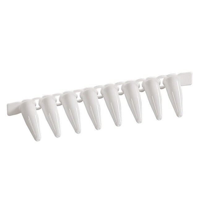 0.1 mL PCR 8-strip tubes in white designed for reduced evaporation and compatibility with common thermal cyclers. Made from USP grade VI polypropylene, these low-profile tubes are free of DNase, RNase, human DNA, and common PCR inhibitors, and accept standard 8-strip caps.