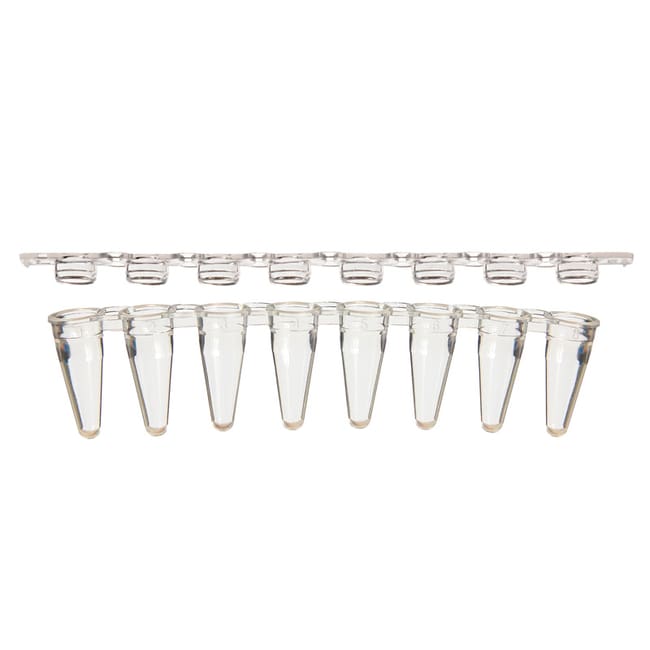 0.1 mL TempAssure PCR flex-free natural color 8-tube strips with separate optically clear 8-cap (flat top) strips, natural. 125 strips each of tubes and caps per pack.