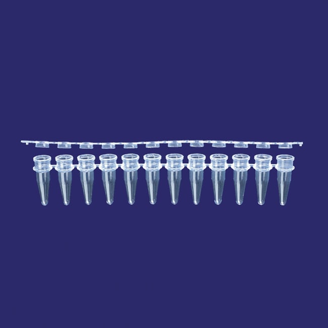 0.2 mL TempAssure PCR 12-tube strips with separate optically clear 12-cap (flat top) strips, natural. 80 strips each of tubes and caps per pack.