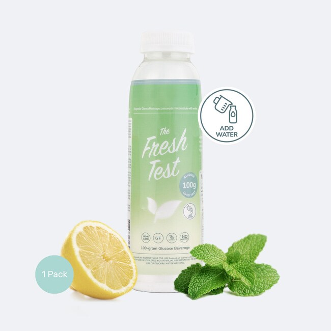 The Fresh Test 100g Glucose Bottle - Plastic is a diagnostic glucose beverage used in the screening of Diabetes Mellitus and Gestational Diabetes Mellitus. Each bottle contains 100 grams of glucose in powder form. Patients should add water to the fill line, shake well, and consume within 5 minutes for a Glucose Load Test.