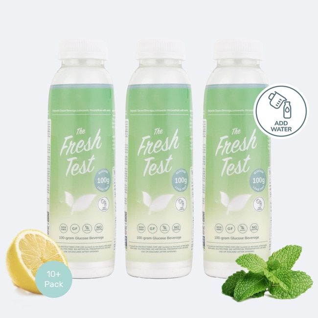 The Fresh Test 100g Glucose Bottle - Plasticis a diagnostic glucose beverage used in the screening of Diabetes Mellitus and Gestational Diabetes Mellitus. Each bottle contains 100 grams of glucose in powder form. Patients should add water to the fill line, shake well, and consume within 5 minutes for a Glucose Load Test.