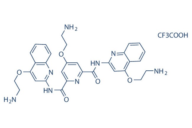 Pyridostatin Trifluoroacetate Salt is a G-quadruplexe stabilizer with Kd of 490 nM in a cell-free assay, which targets a series of proto-oncogenes. *For Research & Development use only. Product is not intended for drug, household, or human consumption.