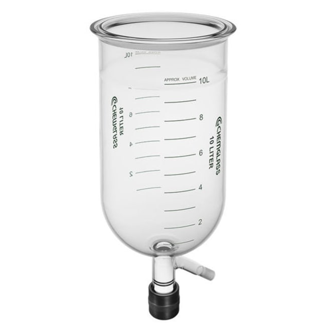 Chemglass 10 L unjacketed reaction vessel for process-scale laboratory reactions. It features graduated markings for approximate volume, a 200 mm flange designed for greased seals with compatible lids, and a spring-loaded bottom drain for controlled discharge across a wide temperature range.