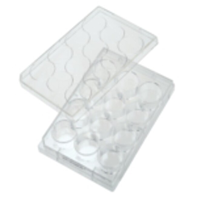 12 Well Tissue Culture Plate with Lid, Individual, Sterile, 100 per case. Polystyrene. Flat Bottom with Lid. Tissue Culture Treated. Cell Growth Area: 3.85cm2. RNAse/DNase Free. Non-pyrogenic. Plates are labeled with alpha-numeric markings for easy identification of individual wells. Each well has a raised rim which nests into the rings on the single direction lid to reduce evaporation and limit the risk of cross contamination. Lids have a stacking feature for added stability when handling tall stacks of plates.