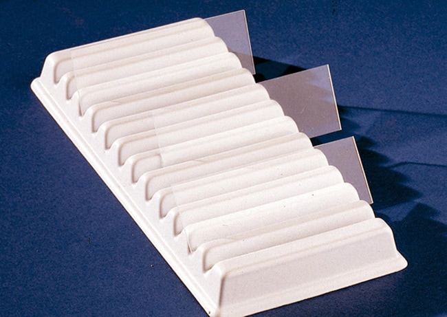 White thermo-formed poly-styrene. It keeps microscope slides separated. Ideal for use where slide preparation or staining is performed. Measurements: 3 3/8"x7"x 3/4" (H) (86x178x19 mm)