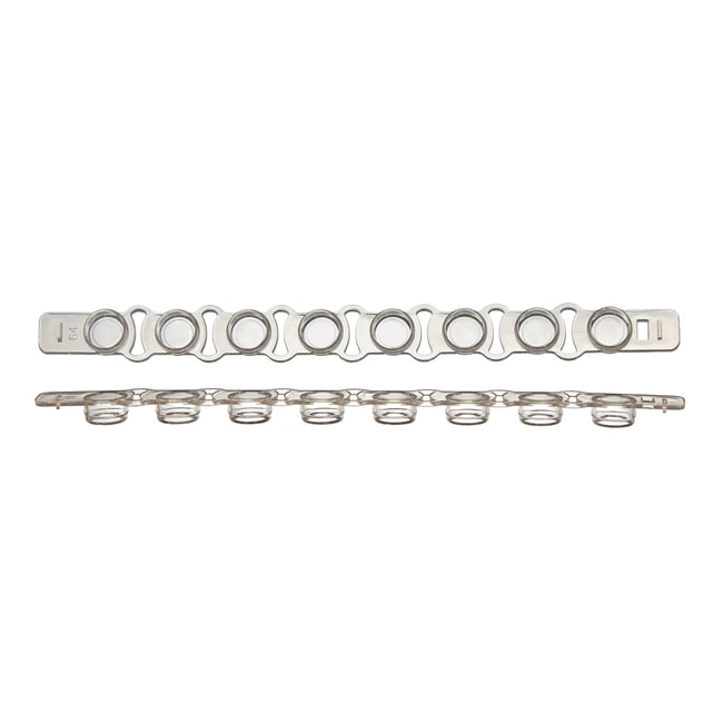 12-cap strip for 0.2 mL PCR tubes and plates, optically clear flat top, natural, 80 strips (960 caps) per pack. Polypropylene.