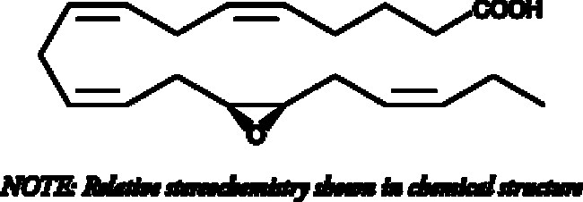 EDHF is an unidentified mediator released from vascular endothelial cells in response to acetylcholine and bradykinin which is distinct from the NOS- (NO) and COX-derived (prostacyclin) vasodilators.{6485,7204} CYP450 metabolism of PUFAs, produces epoxides such as (±)14(15)-EpETrE which are prime candidates for the actual active mediator.{5826} However, the CYP450 metabolites of EPA (Item No. 90110) and DHA (Item No. 90310) have been little studied relative to arachidonate epoxygenase metabolites. (±)14(15)-EpETE is the ω-3 homolog of (±)14(15)-EpETrE, derived via epoxidation of the 14,15-double bond of EPA. The EDHF activity of (±)14(15)-EpETE has not yet been determined.