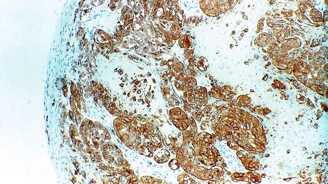 Antigen Background The biosynthesis of melanin in melanocytes involves a family of enzymes, a key member of which is tyrosinase. Tyrosinase deficiency is associated with various forms of albinism and in particular oculocutaneous albinism. L-tyrosinase is the initial substrate for melanin biosynthesis and its conversion to dopaquinone is catalyzed by tyrosinase, whose expression is reported in melanocytes and melanomas. Disclaimer Tyrosinase is recommended for the detection of specific antigens of interest in normal and neoplastic tissues, as an adjunct to conventional histopathology using non-immunologic histochemical stains.