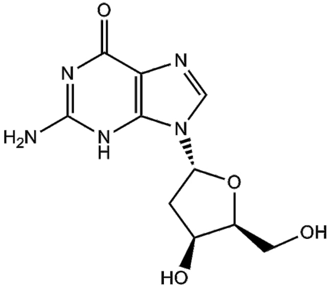 2 -Deoxyguanosine (CAS 961-07-9) is a purine deoxyribonucleoside comprising guanine coupled to a deoxyribose moiety As an essential constituent of DNA it serves as a substrate in multiple nucleotide metabolism pathways Its interconversion with 2 -deoxyguanosine 5 -monophosphate is mediated by purine 5 -nucleotidase and deoxyguanosine kinase reflecting its role in nucleic acid turnover In biomedical research 2 -deoxyguanosine is utilized to study DNA synthesis repair mechanisms and enzymatic processes involving nucleoside metabolism Altered deoxyguanosine homeostasis has been implicated in purine nucleoside phosphorylase deficiency underscoring its significance in inherited metabolic disorders