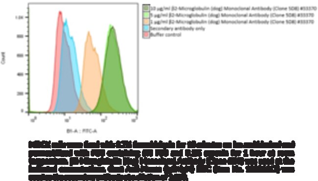 Immunogen: Recombinant dog β2-microglobulin protein (amino acids 28-125) • Host: Mouse • Species Reactivity: (+) Dog • Cross Reactivity: (+) β2-microglobulin • Applications: FC, IP • MW = 14 kDa