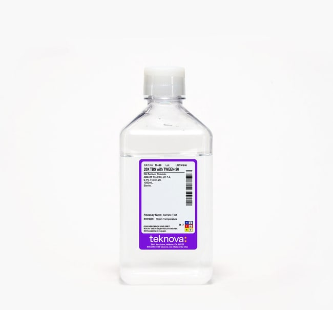 Teknova 20X TBS with 0.1% Tween-20. (400mM Tris, 3M NaCl) 1000mL, Sterile. 2 pack.