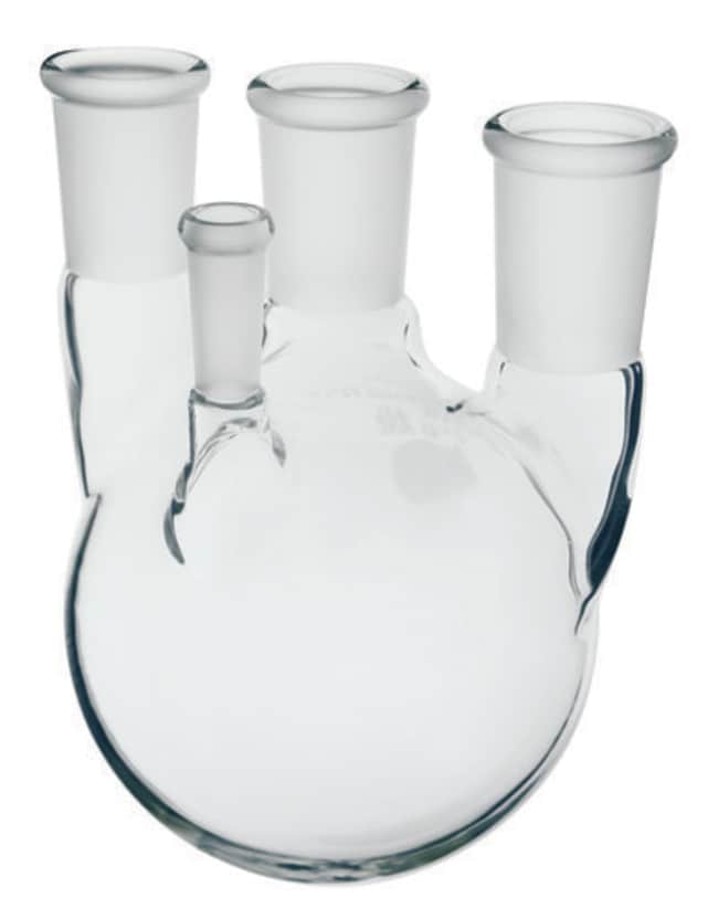Flask, Round Bottom, 250mL, Heavy Wall, 29/26 - 29/26, 10/30 Thermometer Joint, 4-Neck. Round bottom, HEAVY WALL, four-neck flask with standard taper outer joints on the center neck and vertical side necks. The third neck is a 10/30 outer joint for use with a CG-3506, 10/30 jointed thermometer. Flasks with 29/26 center necks have a groove tooled just below the grind to aid in the clamping of the flask.
