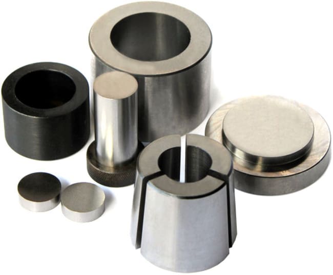 A set of round easy-retrieve 25mm diameter (ID) hardened steel trapezoidal split sleeve dry pressing die set for pellet presses, ready for you to make 25mm diameter cylinder-shaped pellets. These die sets are professionally built for you to work with samples that tend to stick to the inner surface of the sleeve, trapezoidal split inner sleeves with pellet ejector make sample releasing a snap.