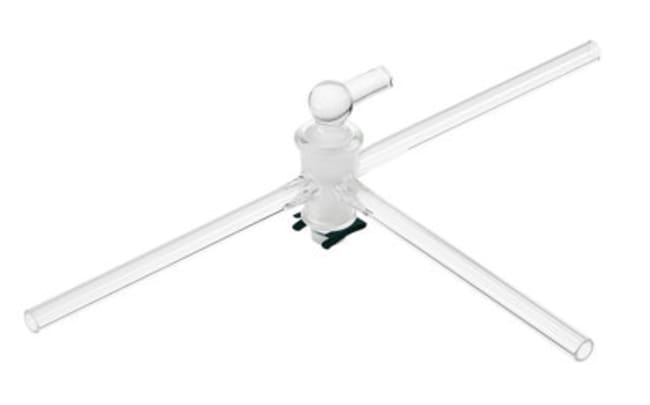 Stopcock, T-Bore, Glass Plug, 2mm Bore, 17/40 Plug Size, 8mm OD Sidearms, #1 Clip Size. Stopcock has three sidearms sealed 90¿ apart. The solid glass plug has a "T" shaped bore so that any two or all three sidearms can be connected at one time. All sizes are supplied complete with a metal retaining device CG-423.
