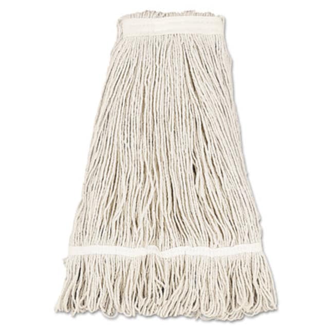 Sturdy mop head made with premium four-ply yarn. Looped-end design minimizes less lint, fraying and unraveling. Durable double-sewn tailband prevents tangles and provides more floor coverage. Heavy-duty polyester tape headband. Made from high-quality fiber. Great for general cleaning or floor finishing. For use with clamp-style mop handle (sold separately).