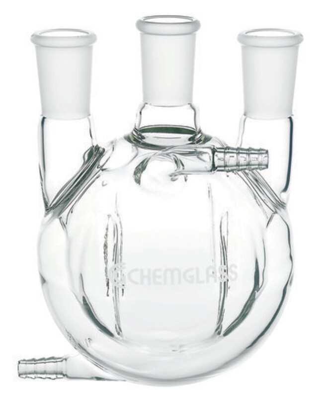 Flask, Round Bottom, 3000mL, Heavy Wall, 45/50 - 24/40, 3-Neck, Vertical, Jacketed. Round bottom, HEAVY WALL, three-flask with standard taper outer joints on the center and side necks. Entire body of the flask is jacketed and has two hose connections for circulation of heating or cooling liquid. Indentations increase agitation of the contents of the flask during stirring.