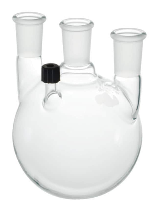 Flask, Round Bottom, 3000mL, Heavy Wall, 45/50 - 24/40, # 7 Chem-Thread Side Neck, 4-Neck. Round bottom, HEAVY WALL, four-neck flask with standard taper outer joints and a # 7 Chem-Thread for insertion of thermometers or bleed tubes having an O.D. between 4 and 7mm.