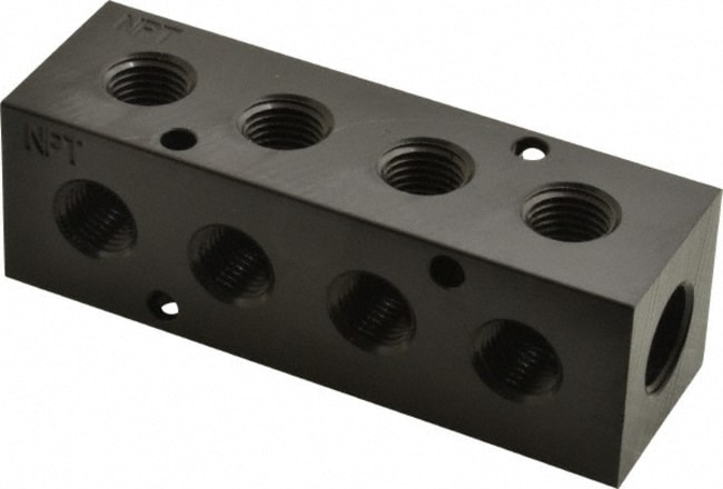 MSC Made in USA PCM20-250R-04B 3/8" Inlet, 1/4" Outlet Manifold 4.12" Long x 1-1/4" Wide x 1-1/4" High, 0.2" Mount Hole, 2 Inlet Ports, 4 Outlet Ports