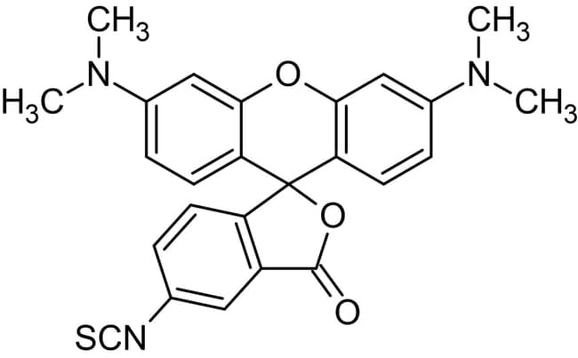 MW 443.52 g/mol, Purity >95%. Amine and nucleic acid reactive fluorescent probe. 6-TRITC (ab145403) and 5(6)-TRITC (ab145353) S-isomer. Spectrally similar to TAMRA (ab145282, ab145438, ab145338, ab146486, ab145334, ab145433). Biodistributes covalently linked to poly(lactic-co-glycolic) acid (PLGA) and PLGA/chitosan nanoparticles after oral administration.