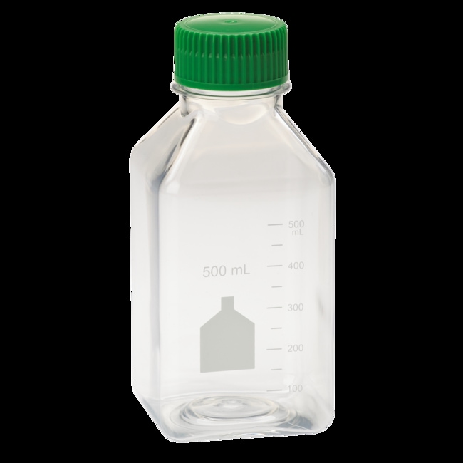 Lightweight plastic material is easier and safer to handle than glass. Square bottle shape conserves space in refrigerated storage areas. Wide mouth design minimizes contamination risk when pipetting media and solutions. Clearly printed graduations for quick volume reference. Defined marking area is easy to write on. Bottles are sterile, available individually wrapped or tray packed with 12 bottles per tray. PET material reduces gas permeability and improves solution stability compared to polystyrene. Both PET and PETG media bottles have equivalent performance and share key material properties, such as operating temperature range (-80°C to 60°C) and chemical compatibility