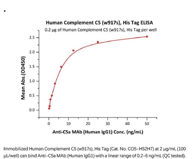 Recombinant Protein;1MG;Human Complement C5 (w917s), His Tag (CO5-H52H7) is expressed from human 293 cells (HEK293). It contains AA Gln 19 - Cys 1676 (Accession # P01031-1 (W917S)).;This protein carries a polyhistidine tag at the C-terminus. The mature form of Complement C5 is a disulfide-linked heterodimer composed of proteolytically cleaved α and β chain. Each α and β chain has a calculated MW of 73.9 kDa (β chain) and 114.3 kDa (α chain). The protein migrates as 80 kDa (β chain) and 110 kDa (α chain) under reducing (R) condition (SDS-PAGE) due to glycosylation.;Immobilized Human Complement C5 (w917s), His Tag (Cat. No. CO5-H52H7) at 2 μg/mL (100 μL/well) can bind Anti-C5a MAb (Human IgG1) with a linear range of 0.2-6 ng/mL (QC tested).