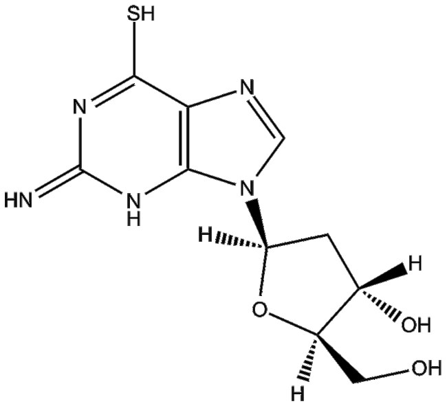 6-Thio-2 -deoxyguanosine (6-Thio-dG CAS 789-61-7) is a nucleoside analogue that functions as a telomerase-mediated telomere targeting agent In telomerase-positive cancer cells 6-Thio-dG is incorporated into telomeric DNA inducing rapid telomere dysfunction independent of direct telomerase inhibition which leads to growth arrest and cell death In vitro cancer cell lines exhibit IC50 values ranging from 0 7 to 2 9 M indicating high sensitivity to the compound Normal cells with telomerase-silent status show minimal morphological effects upon 6-Thio-dG exposure In vivo 6-Thio-dG administration inhibits tumor growth and reduces proliferation markers in xenograft models The compound is valuable for investigating telomere biology and as a tool to evaluate telomerase-dependent therapeutic strategies in cancer research