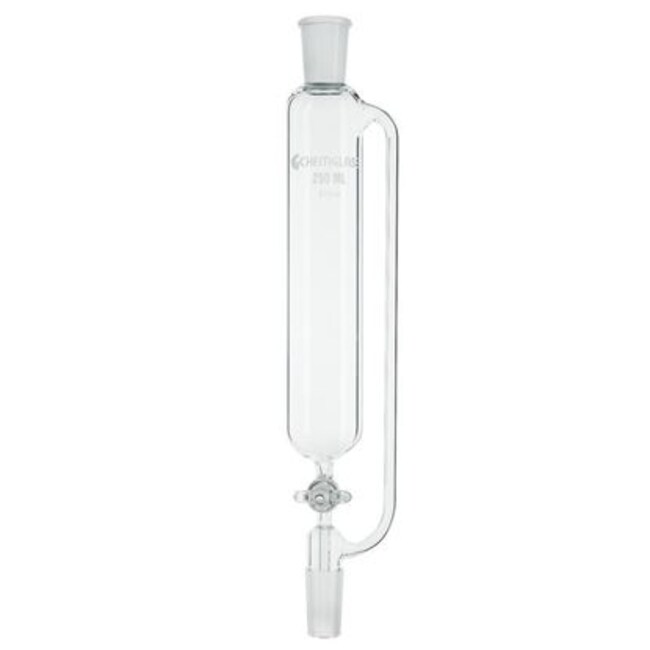 The Chemglass 60 mL graduated addition funnel is a cylindrical glass funnel designed for controlled, pressure-equalized addition of reagents in laboratory workflows. It provides accurate dosing with a double graduation scale and includes a pressure-equalizing arm and a 2 mm glass stopcock. Funnels with 14/20 joints are supplied complete with a stopper.