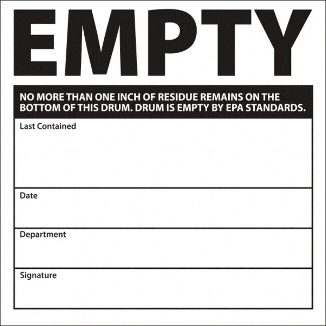 Shipping & DOT Label: "Empty No More than One Inch Of Residue Remains On The Bottom Of This Drum. Drum Is Empty By EPA Standards. Last Contained ____ D", Square, 6" Wide, 6" High