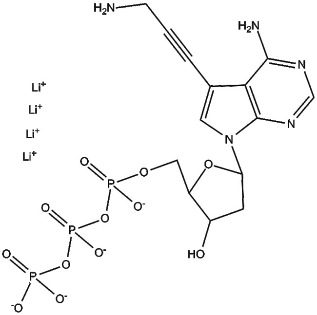 7-Deaza-7-Propargylamino-dATP is a chemically modified nucleotide analog derived from deoxyadenosine triphosphate It is designed to enable enzymatic incorporation by DNA polymerases during DNA synthesis thereby facilitating site-specific labeling of DNA 7-Deaza-7-Propargylamino-dATP exerts its biological activity primarily through incorporation into nascent DNA strands introducing a terminal propargyl group that serves as a reactive alkyne handle for conjugation reactions via click chemistry approaches Based on these pharmacological properties 7-Deaza-7-Propargylamino-dATP holds research potential in DNA labeling fluorescent probe generation and studies of DNA polymerase activity specificity and DNA damage detection and repair mechanisms in molecular biology and biomedical research