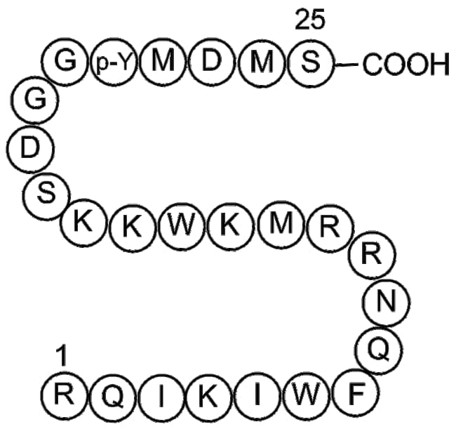 740 Y-P (CAS number 1236188-16-1) is a cell-permeable activator of phosphoinositide 3-kinase (PI3K) PI3K is implicated in various fundamental cellular processes including vesicle transport glucose uptake migration and survival signaling Treatment of human melanoma MNT-1 cells with 740 Y-P at 20 M for 24 hours activates PI3K signaling leading to significant reduction of sucrose-induced vacuole formation In serum-free cultured cerebellar granule neurons 740 Y-P interacts with the regulatory subunit p85 of PI3K promoting Akt phosphorylation and thus enhancing cell survival This compound is commonly employed in scientific research to study PI3K/Akt-mediated mechanisms