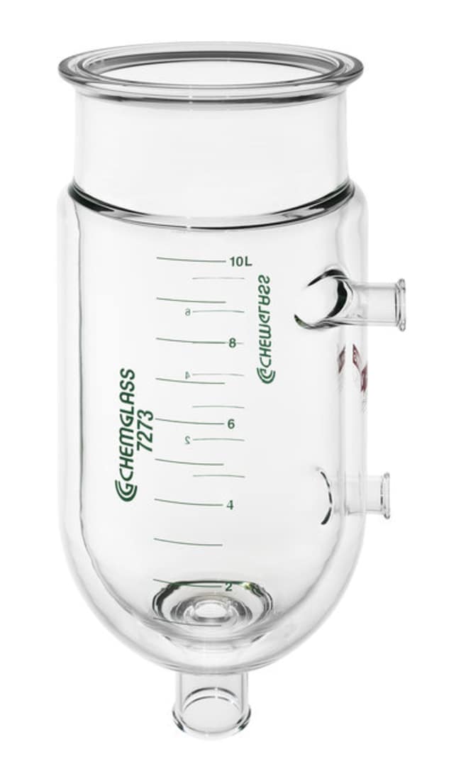 Process reaction vessel, jacketed, Capacity Liters: 75, Flange I.D. (mm): 300, Valve Style: 2" BP Detachable, Overall Height mm (in.): 899 (35.4), Height to Width Ratio: 2.0:1, Inlet/Outlet Size: 1 1/2" BP, Jacket Capacity Liters: 27. Jacketed large scale process reaction vessels. The 30, 50, 75, and 100L have a 300mm ID flat ground flange. The inlet/outlet of the vessels are beaded pipe fittings for use with the CG-1964 and CG-1969-A beaded pipe adapters. These flush bottom (zero dead space) valves are designed to prevent solids from collecting in the bottom of the vessel. Vessels equipped with the 0-20mm sealed on valve are supplied complete with a TFE plug having Perfluoro chemically resistant o-rings. The 20, 30, 50, 75 and 100L vessels equipped with the detachable zero dead space valve have a lower silicone seal. Vessels are serial numbered and have a graduation scale on both sides showing the approximate volume.