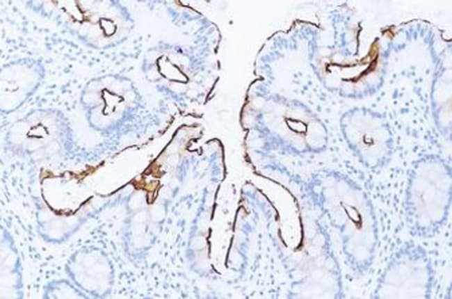 Antigen BackgroundCD66a antigen, also known as biliary glycoprotein (BGP), is a member of the carcinoembryonic antigen (CEA) family and of the immunoglobulin super-family. CD66a, CD66b, CD66c and CD66d are known to be expressed by hematopoietic cells. CD66a antigen is also expressed in epithelia, in certain endothelia and in cells of the myeloid lineage. In liver, expression occurs in hepatocytes along the bile canaliculi. Apical membranous expression of the antigen is reported to occur in enterocytes, superficial absorptive cells of the colon, epithelia of oesophageal and Brunner's glands, bile ducts and gall bladder, pancreatic ducts, proximal tubules of the kidney, prostate, endometrium and mammary ducts.