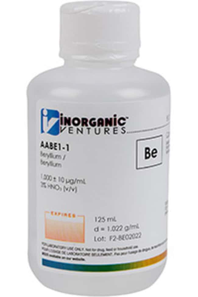 Inorganic Ventures' 1000 ppm (µg/mL) Beryllium for AA is a 125mL reference material set in a nitric acid matrix for stability. This beryllium standard is Traceable to NIST and manufactured in accordance with our stringent Quality Assurance guidelines. See Certificate of Analysis for expiration.