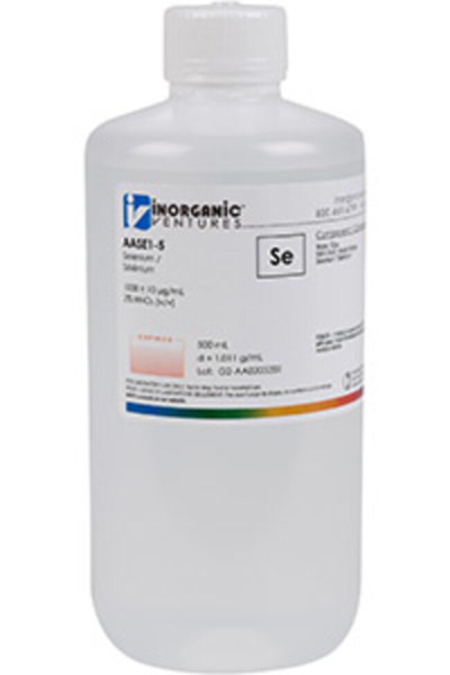 Inorganic Ventures' 1000 ppm (µg/mL) Selenium for AA is a 500mL reference material set in a nitric acid matrix for stability. This selenium standard is Traceable to NIST and manufactured in accordance with our stringent Quality Assurance guidelines. See Certificate of Analysis for expiration.