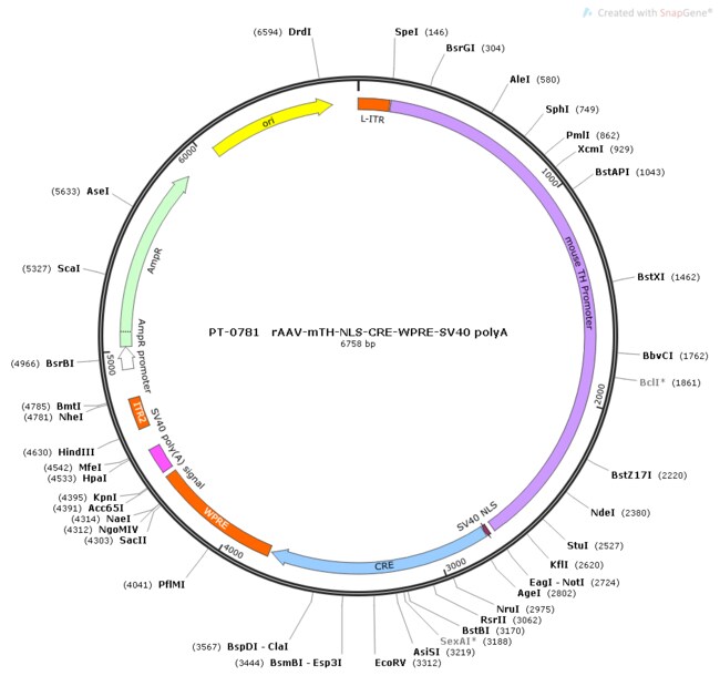 Recombinant adeno associated virus expressing Cre under the mTH promoter with WPRE and hGH polyA elements. The Cre dependent configuration enables expression only after recombination, providing precise targeted control of targeted neurons. Offered under the Biohippo AAVX Series with multiple serotypes available including AAV2/1, AAV2/2, AAV2/5, AAV2/6, AAV2/6m, AAV2/6.2FF, AAV2/7m8, AAV2/8, AAV2/9, AAV2/DJ, AAV2/DJ8, AAV2/Retro, AAV2/PHP.eB, AAV2/PHP.B, AAV2/rh10, AAV2/PHP.S, AAV2/anc80, AAV2/B10, AAV2/olig001, AAV2/BI30, AAV2/BR1, AAV2/MG1.2, AAV1/2, AAV2/MaCPNS1, and AAV2/MaCPNS2. Regular titer is greater than or equal to 2.00E+12 vg per mL, with high titer greater than or equal to 1.00E+13 vg per mL available upon request at no additional cost. Customers may specify preferred serotype and titer when placing orders.