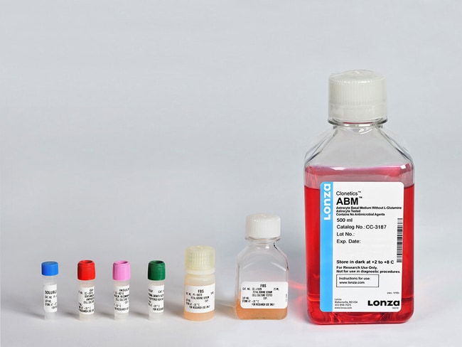 Clonetics AGM Astrocyte Growth Medium has been developed to support the growth of primary human astrocytes.Clonetics Media Products are provided as convenient BulletKits which contain basal medium and necessary growth factors. Basal medium and SingleQuots Kit growth factors are available separately.Clonetics Media Prodcuts are specially designed to support the growth of human and animal primary cells. Media systems have been specifically developed and optimized for various cell systems.Media are supplied in several formats:Basal Medium - contains no growth factors cytokines, or supplementsSingleQuots - growth factors, cytokines, and supplementsBulletKits - basal media and SingleQuots Kit packaged togetherContent:Astrocyte basal medium (500 mL) (no growth factors)