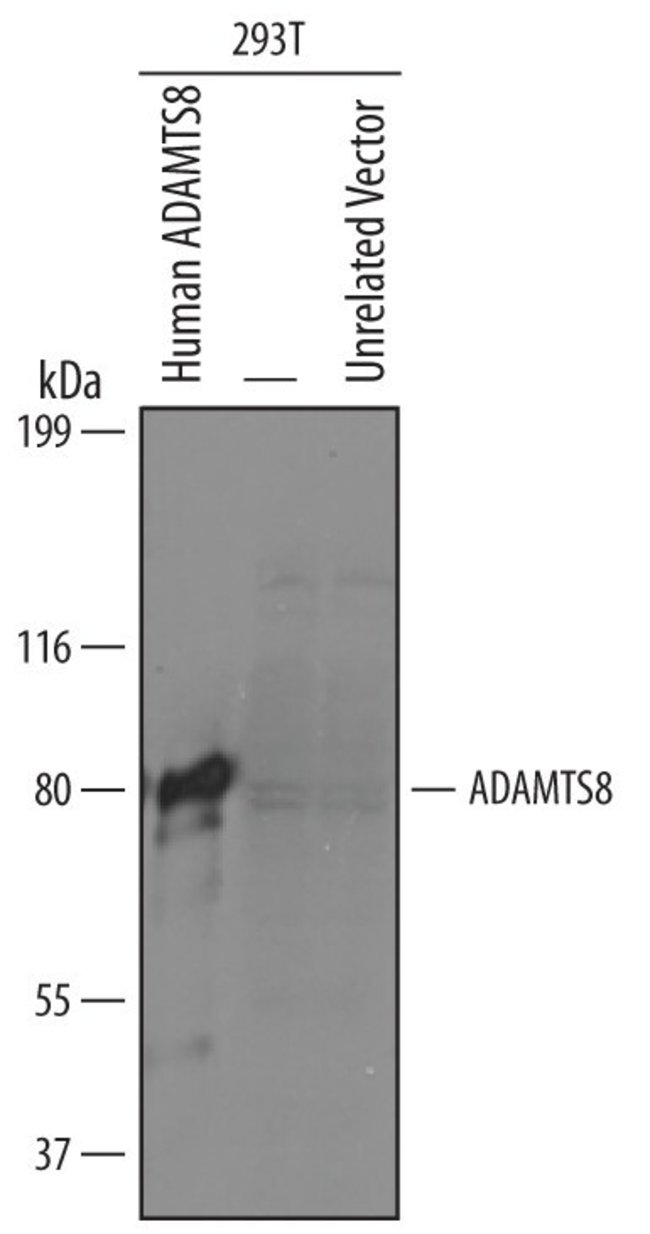 In direct ELISAs, approximately 5% cross-reactivity with recombinant human (rh) ADAMTS1 is observed and less than 1% cross-reactivity with rhADAMTS1, rhADAMTS3, rhADAMTS4, rhADAMTS5, rhADAMTS10, rhADAMTS12, rhADAMTS13, and rhADAMTS16 is observed. Reconstitute in sterile PBS to a final concentration of 0.2 mg/mL.
