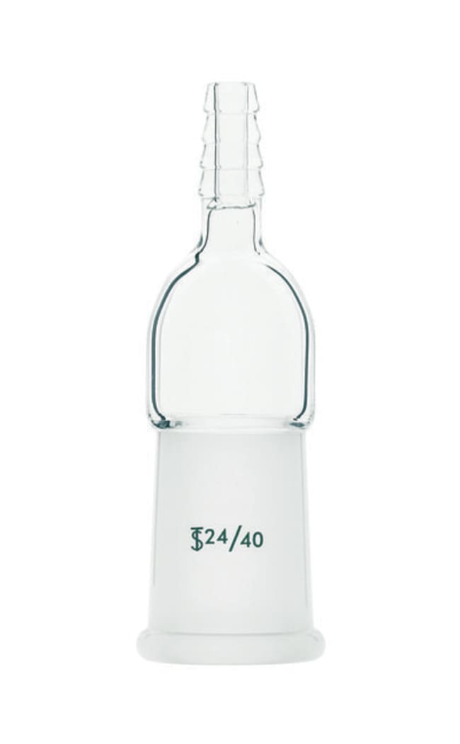 Adapter, Inlet, 29/42 Outer Joint, 100mm Height. Allows for flexible tubing to be connected to apparatus for introduction of vacuum or pressure. Hose connection has an O.D. of 10mm at the largest serration.