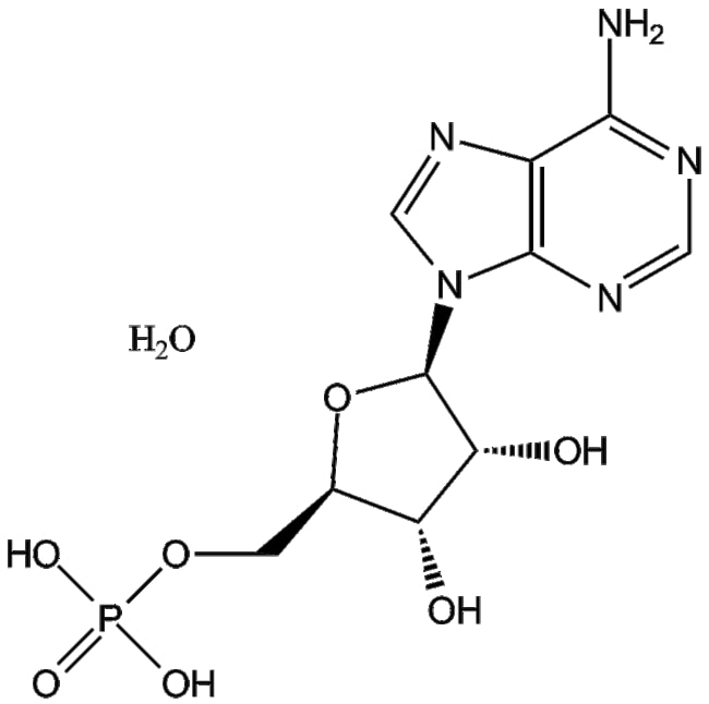 Adenosine 5 -monophosphate monohydrate (CAS 18422-05-4) is a selective small-molecule agonist targeting the adenosine A1 receptor It is designed to activate the receptor thereby modulating intracellular signaling pathways associated with viral replication inhibition Adenosine 5 -monophosphate monohydrate exerts its biological activity primarily through adenosine A1 receptor activation leading to disruption of key steps in herpes simplex virus type-1 (HSV-1) and type-2 (HSV-2) genome synthesis and propagation In in vitro studies Adenosine 5 -monophosphate monohydrate demonstrates inhibition of HSV viral replication with an IC50 value ranging from 10 20 M Based on these pharmacological properties Adenosine 5 -monophosphate monohydrate holds research potential in antiviral drug development and mechanistic studies related to adenosine receptor-mediated signaling