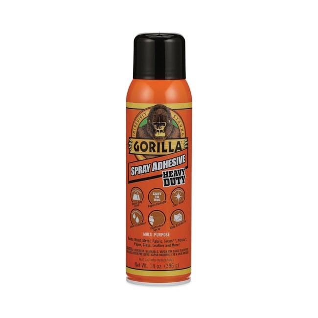 Gorilla Spray Adhesive is heavy duty multi-purpose and easy to use While repositionable for up to 10 minutes Gorilla Spray adhesive forms a clear permanent bond that is photo safe Its wide pad nozzle and controlled fine mist provide an even application on the project you are working on Adhesive Type- Aerosol/Spray Product Packaging- Can Washable/Removable- No Color on Application- Clear