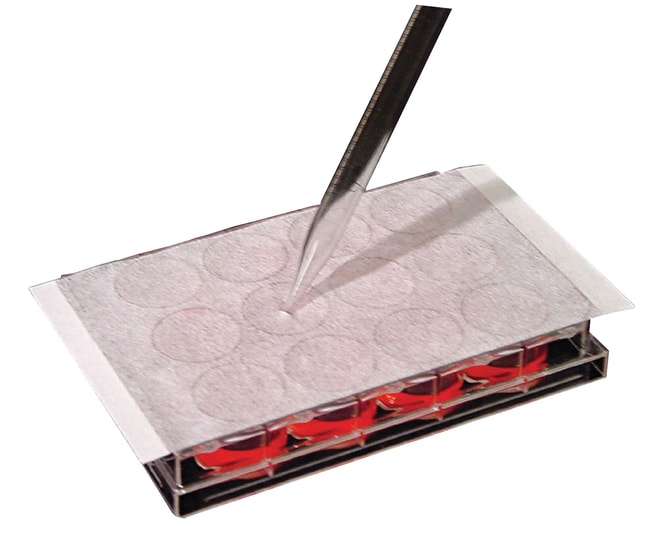 A 140um thick hydrophobic porous rayon sealing film including medical-grade adhesive for tissue culture plates, bio-blocks and 96-well plates where gas exchange is necessary for cell or bacterial growth. AeraSeal film minimizes cross-contamination between wells and reduces sample evaporation. Unique micro-porous design allows uniform air and CO2 exchange between wells for optimum cell growth or bacterial cultivation. This adhesive film provides a leak tight seal on culture plates or 96 well assay plates. Film can be easily pierced for sample recovery using a single or multi-channel pipettor.