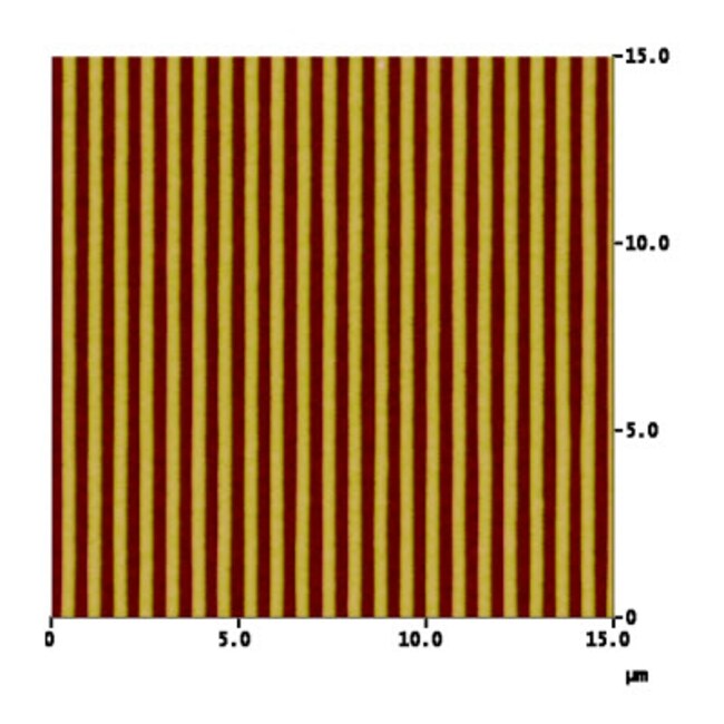 SPM calibration specimens are produced by holographic fabrication that assures high accuracy and precision. The standards provide easier testing of your SPM, improved accuracy of critical dimension measurements and accuracy of 0.5% (1 std. dev.). The pattern height of greater than 100nm provides excellent image contrast. There is uniform coverage of entire chip which allows for imaging anywhere on the chip. 700-1D, pattern: parallel ridges, nominal pitch: 700 nm, material: W-coated photoresist on Si.