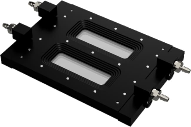 Biosurface Technologies Corp Dual Channel Transmission Flow Cell (aluminum flow channel; microtiter plate footprint), for Growing and Imaging of Biofilms.