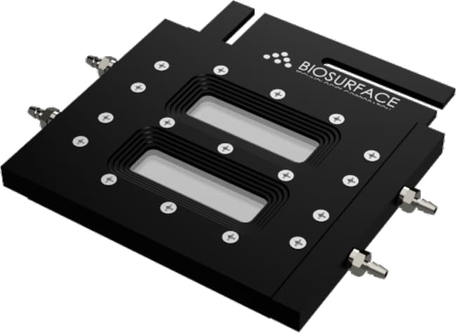 Biosurface Technologies Corp Dual Channel Transmission Flow Cell (aluminum flow channel; platform stage mount), for Growing and Imaging of Biofilms.