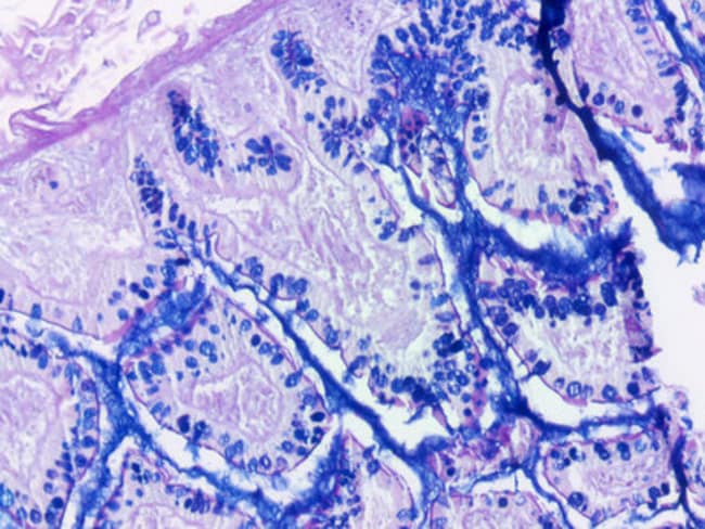Newcomer Supply Alcian Blue/PAS Control Slides are for the positive histochemical staining and differentiation of acidic epithelial mucins (sialomucin, sulfomucin), stromal (mesenchymal) mucin, neutral mucins and glycogen. Alcian Blue/PAS Control Slides contain sections of positive staining small intestine.