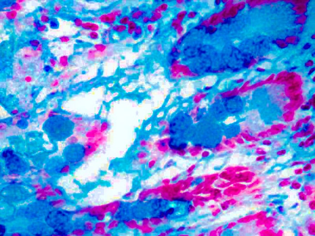 This kit stains strongly sulfated mucosubstances. Strongly sulfated mucosub-stances stain blue in paraffin tissue sections, while the nuclei stain pink to red and the cytoplasm and background stain pale pink.