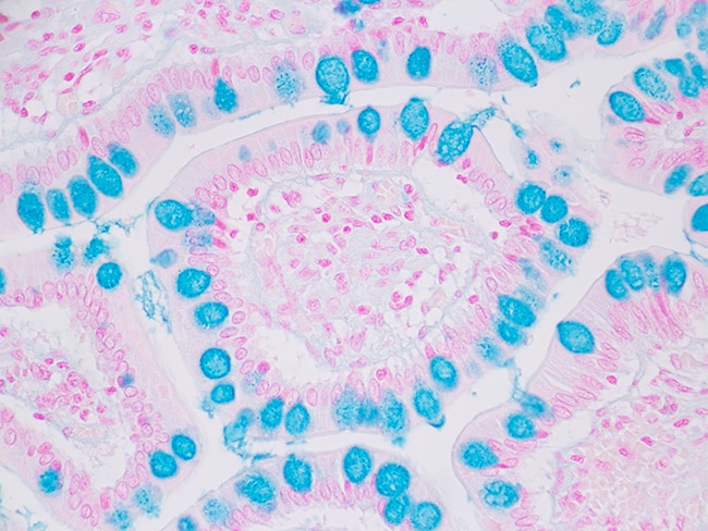 Newcomer Supply Alcian Blue pH 2.5, Goblet Cell Control Slides are for the positive histochemical staining of goblet cells as well as other acid epithelial mucins (sialomucin, sulfomucin). Goblet cells normally line the small intestine but are an abnormal finding in Barrett’s esophagus. Alcian Blue pH 2.5, Goblet Cell Control Slides contain sections of positive staining small intestine.