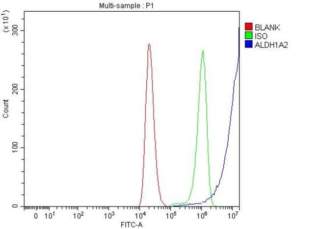 Human ALDH1A2 shares 95.5% amino acid (aa) sequence identity with both mouse and rat ALDH1A2. Reconstitute with 0.2 mL of distilled water to yield a concentration of 500 μg/mL. Positive Control - WB: human K562 whole cell, human 293T whole cell, human HepG2 whole cell, human Hela whole cell, rat kidney tissue, rat testis tissue, mouse kidney tissue, mouse testis tissue. IHC: human colorectal adenocarcinoma tissue, rat lung tissue. Flow: 293T cell. Store at -20°C for one year from date of receipt. After reconstitution, at 4°C for one month. It can also be aliquotted and stored frozen at -20°C for six months. Avoid repeated freeze-thaw cycles.