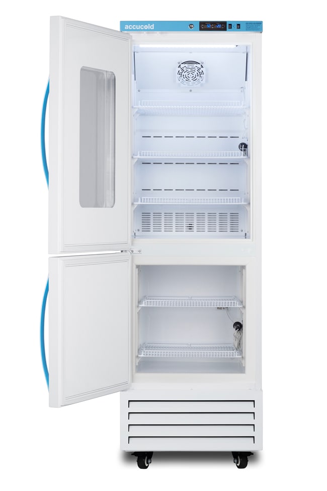 The ARFG15PVDLPWLHD features an upper refrigerator compartment with a small window and independent manual defrost freezer below. Both sections include adjustable plastic-coated wire shelves that can be positioned at 1/2 inch increments to accommodate virtually any sized item. This unit includes LED internal lighting with an on/off rocker switch. The interior is constructed from white powder coated metal to ensure added durability and better temperature retention. The ARFG15PVDLPWLHD features a dual microprocessor temperature controller (refrigerator range: +2 to +8ºC; freezer range: -30 to -10ºC). The buffered temperature probes are encased in glycol-filled bottles to better simulate temperature of the stored product, with an additional sensor that reads air temperature to ensure superior temperature control. This unit ships with PharmaWatch DLPWRF, a wireless environmental temperature monitoring device (ETM) that enables cloud-based data management.
