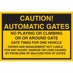 Brady™ Alum Sign: CAUTION - AUTOMATIC GATES. NO PLAYING OR CLIMBING ON OR AROUND GATE. TIMED FOR ONE VEHICLE OWNER…